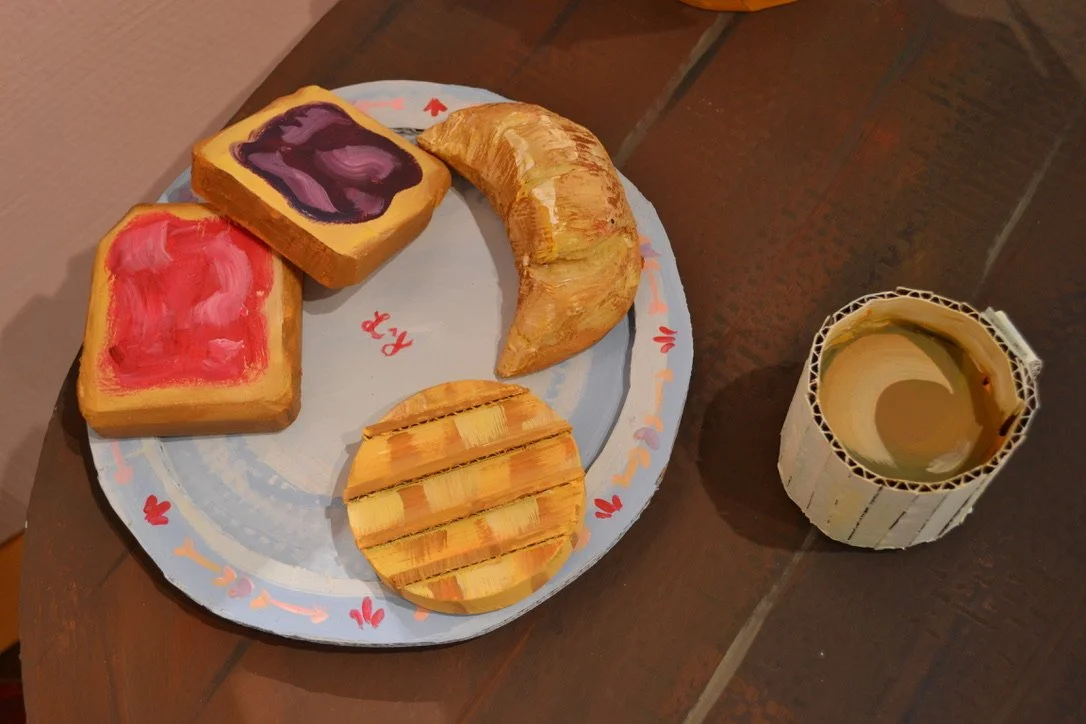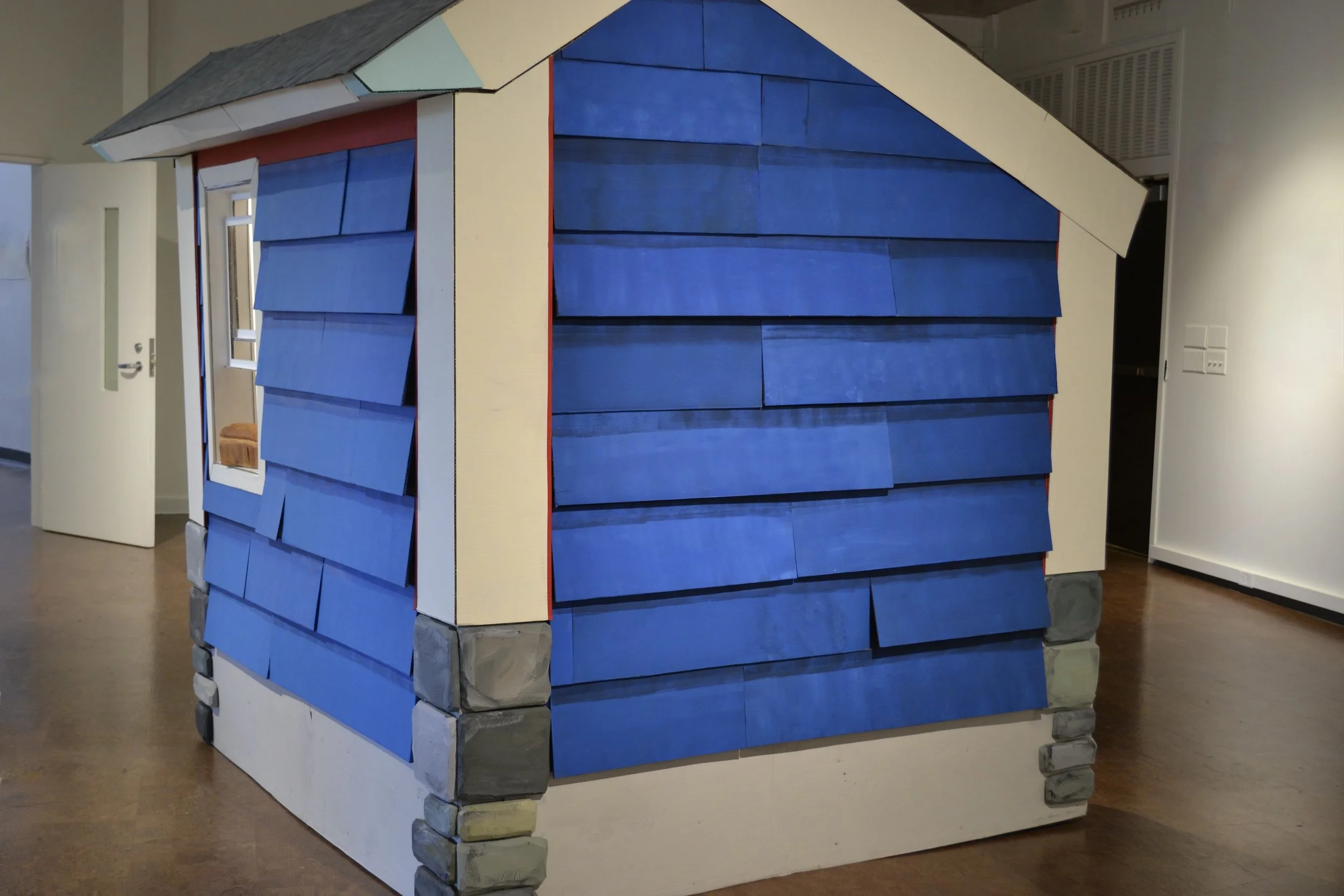 No matter one’s age, imaginations can transport us from reality into new worlds. For me, the imagination is something vital to securing my comfort and joy. In the face of change, I have been picturing this home. It is not the home I grew up in, nor any home that exists, but rather, an abstracted amalgamation of many houses from my memories. As a kid I always used cardboard, hot glue, and craft paint to build different homes and scenes for my figurines. These materials felt natural to me in creating my imagined house.